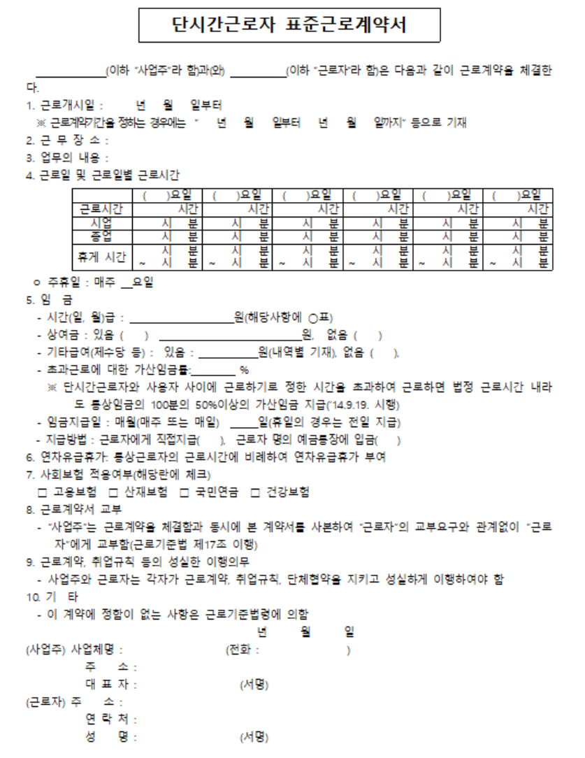 일용직 근로 계약서 (표준 한글 양식)