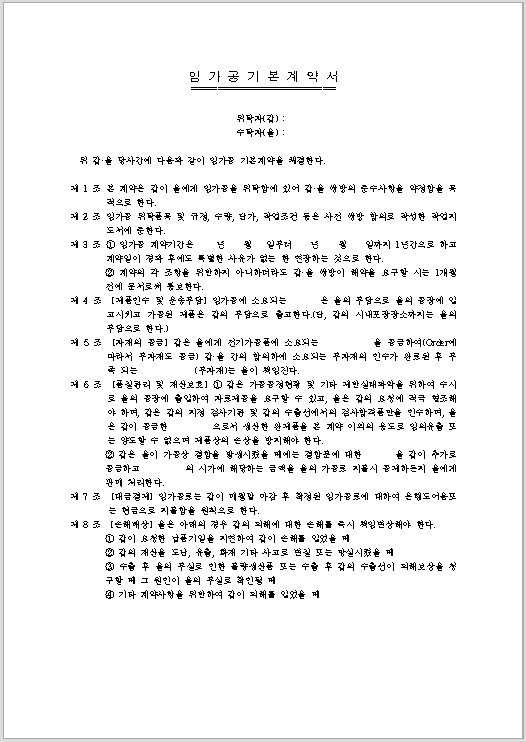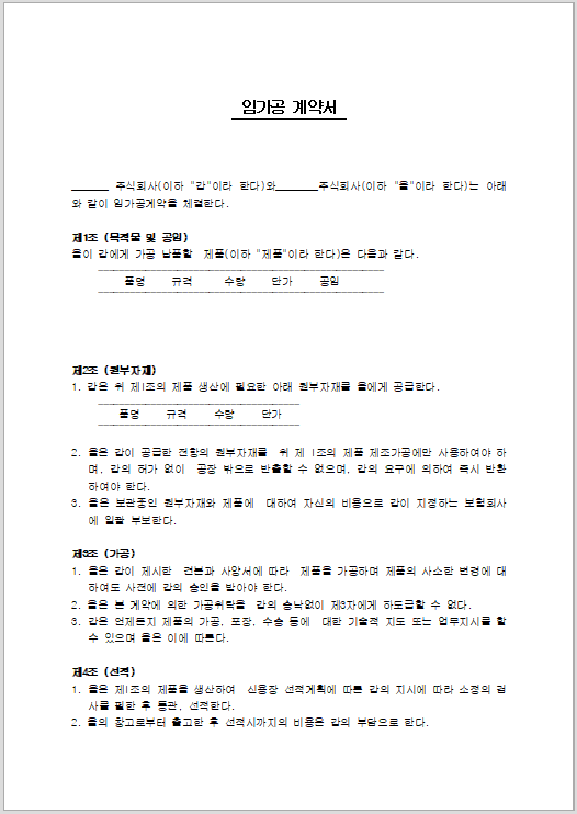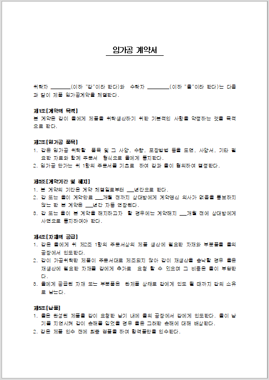 회사에서 많이 사용하는 서식 중에 제조 회사에서 많이 사용하는 것이 바로 임가공 계약서가 아닐까 한다. 그래서 오늘은 임가공 계약서 양식을 공유해볼까 한다. 기본 임가공 계약서 무료 양식이므로 글 하단을 통해서 다운로드하여 이용하시기 바랍니다.