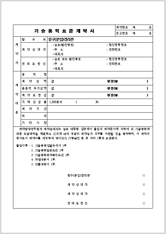 아래 기술 용역 표준계약서 양식 올려 놓으니 필요한 분들은 다운로드하여 이용해 보시기 바랍니다.