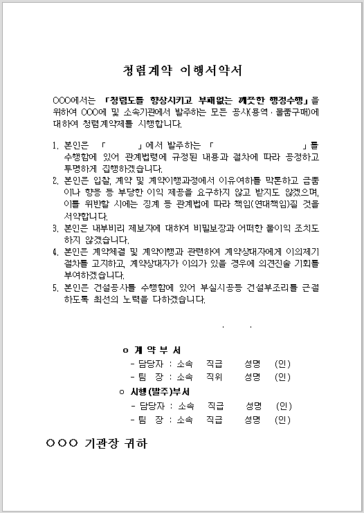 오늘은 무료 청렴 계약 이행서약서 양식을 공유해 볼까 한다. 우리가 어떤 계약을 이행하면서, 회사에서 직원으로 근무를 하면서 여러 가지 부정부패 없이 청렴하게 업무 수행을 한다고 하는 서약서를 청렴 계약 이행 서약서라고 한다.