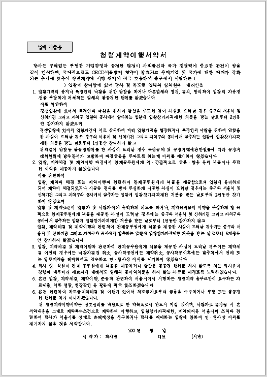 총 두가지 버전으로 올려 둡니다. 첫 번째는 공무원에게 적용되는 청렴 계약 이행서약서 양식이고, 두 번째는 일반 기업이 조달청이나 나라장터등에 제출할때 사용해도 되는 청렴 계약이행 서약서 이다이다.