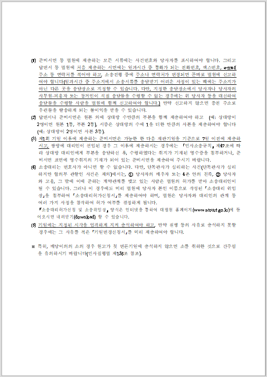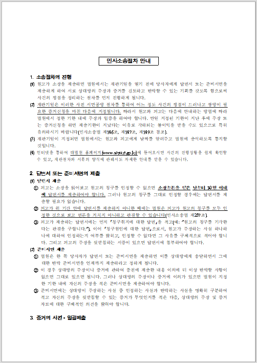 아래 민사소송 절차 안내서를 한글 파일로 공유하니 소송전에 절차가 궁금하시다면 다운 받아서 읽어 보시면 많은 도움이 되실거라 생각합니다.