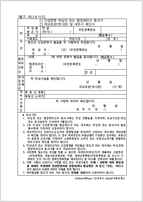 3.재외국민이나 국내거소신고자의 증명발급을 위임하여 신청하는 경우에는 재외공관의 확인을 받아야 합니다. 이 경우 재외국민의 부동산권리 이전용인 경우에는 부동산의 종류과 소재지를 기재하여 소관증명청의 소재지 또는 부동산소재지를 관할하는 세무서장의 확인을 받아야 합니다.