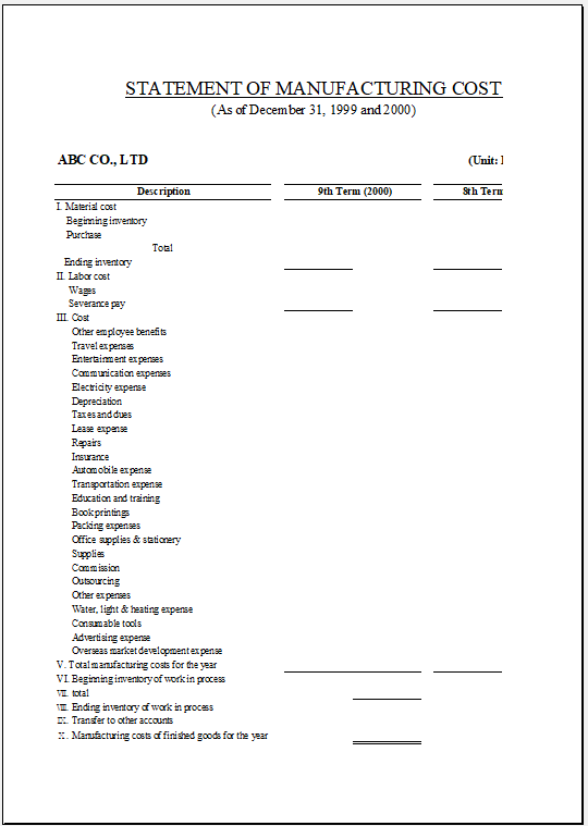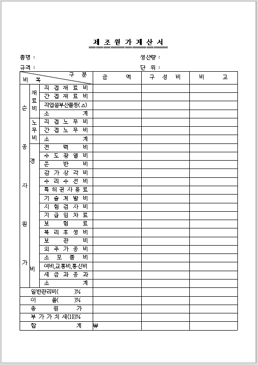 제조 원가 계산서 양식 무료 서식 공유