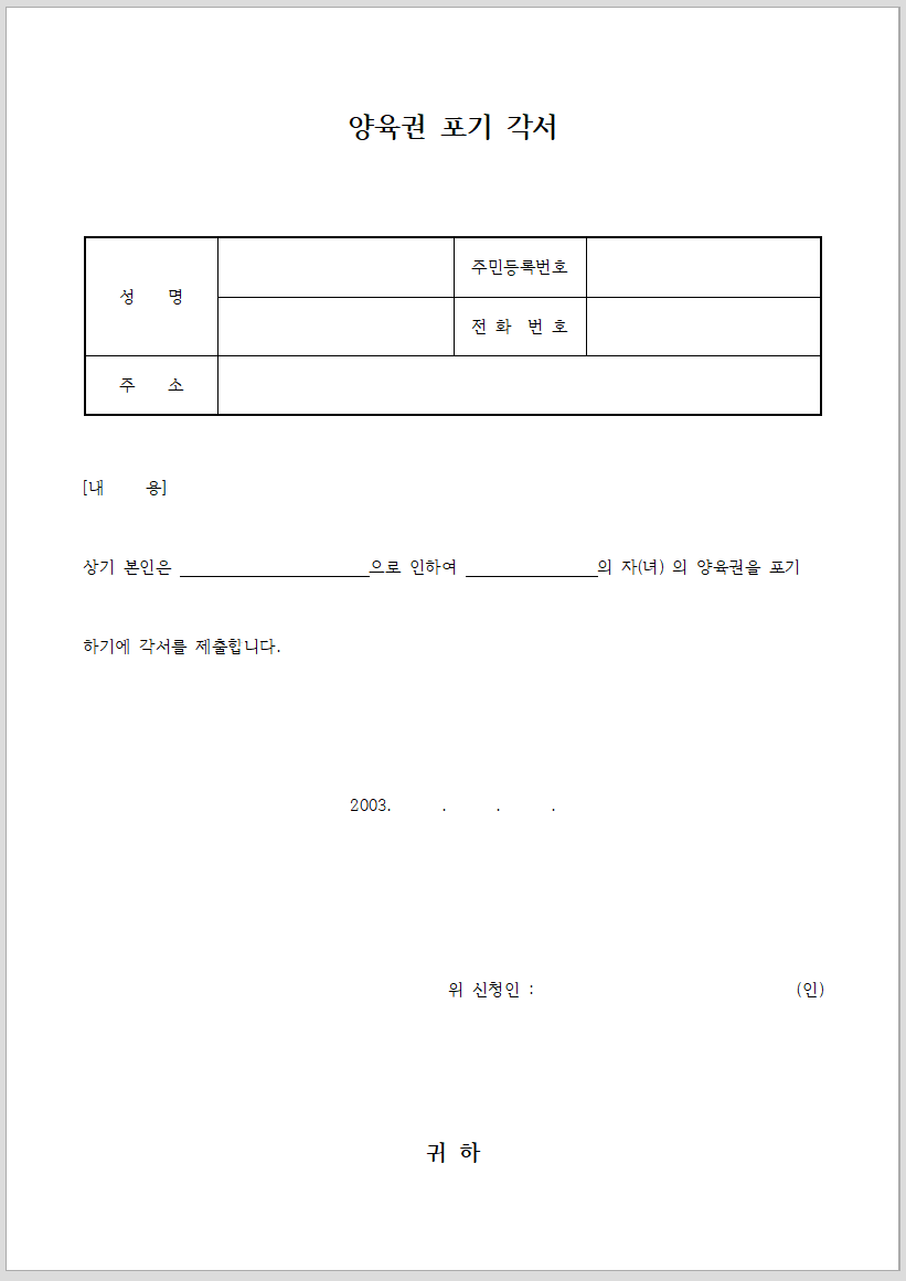 친권 포기 각서 무료 양식 다운 파일 공유, 양식 다운로드 받으세요
