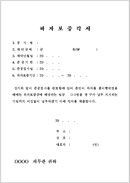 하자보증 이행 각서 양식 서식 무료 버전 공유 합니다.