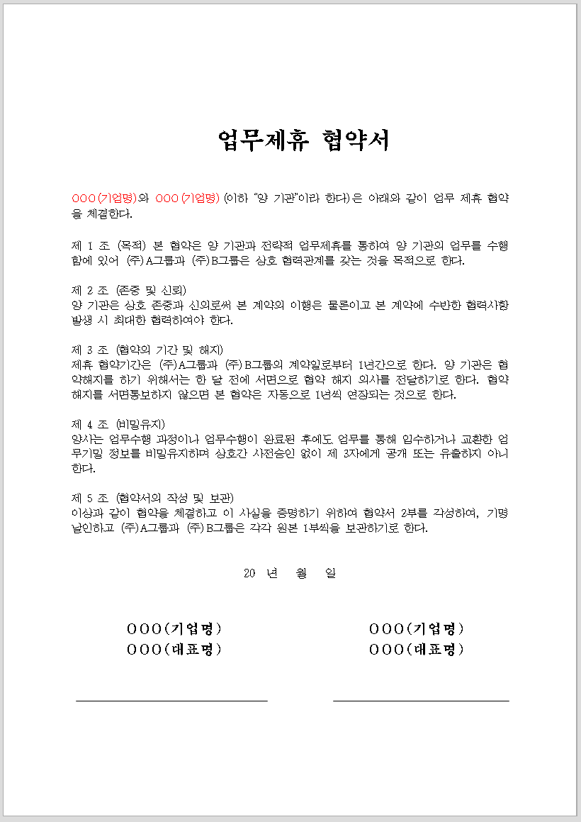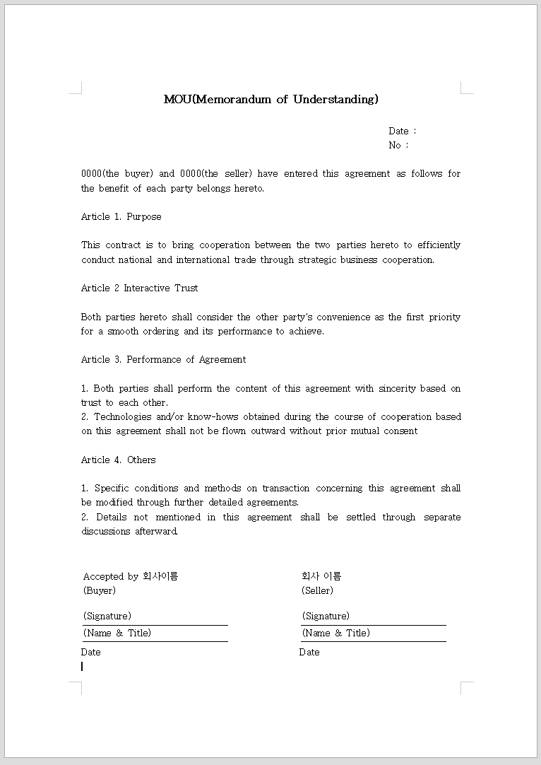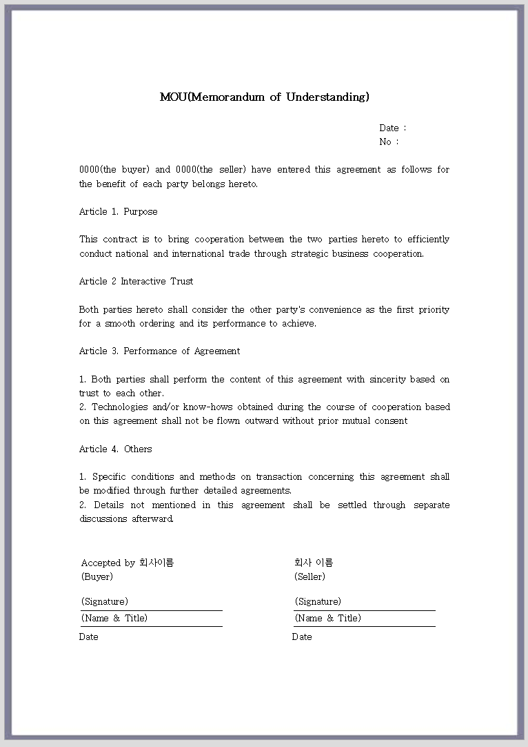 MOU협약서 양식은 우리가 흔히 많이 보는 양식은 아니다 회사와 회사가 만나 특정 프로젝트를 진행하면서 정식 계약 전에 작성하게 되는 것이다. 서로의 참여 의사를 확인하는 협약서라고 볼 수 있다. 그래서 MOU 협약서 양식 무료 다운 버전을 올려 보니다. 필요한 분들은 다운로드하여 이용해 보시기 바랍니다.